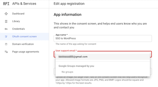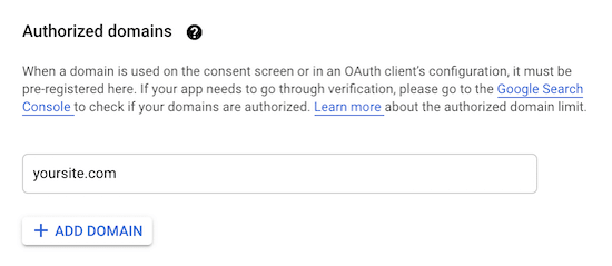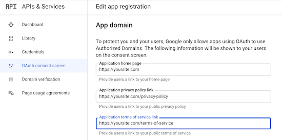 然后,输入您的“应用程序域”信息。您需要填写所有三个字段。Google需要这些信息来确保您的网站符合在线隐私法规和用户同意。