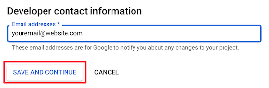 确保您输入的域正确填写了协议http://或https://。接下来,在“开发人员联系信息框”中输入您的电子邮件地址,这样如果您的项目出现问题,Google可以与您联系。