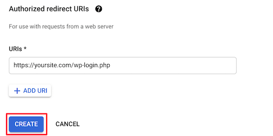 之后,单击“授权重定向URL”部分中的“添加URL”按钮,并输入您的登录重定向URL。此URL是您登录页面的URL。对于大多数WordPress网站,这将是“yoursite.com/wp-login.php”。