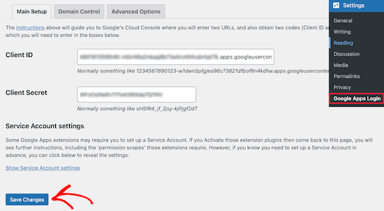 现在你需要回到你的WordPress管理面板,进入设置谷歌应用程序登录。在此屏幕上,您将输入从上面复制的“客户端ID”和“客户端密码”字符串。