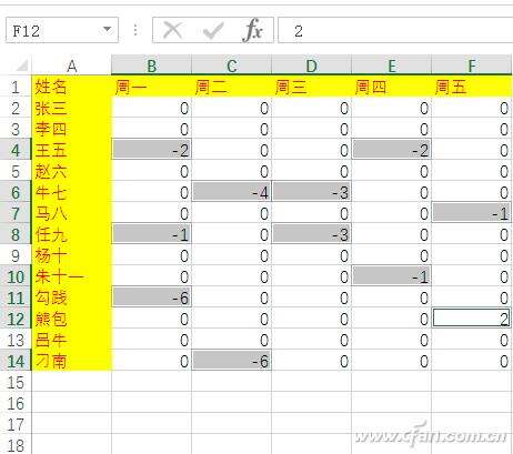 再看表2中的结果,所有标注为非0的单元格,就是被修改过的单元格。这下,哪位哪天的数据做过修正、修正了多少,就一目了然了。