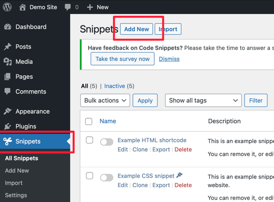 我们将使用代码片段插件,当插件启用时,它将在你的WordPress管理栏添加一个新的标记为片段的菜单项。当点击它时,它将显示一个列表,列出您在网站上保存的所有自定义代码片段。