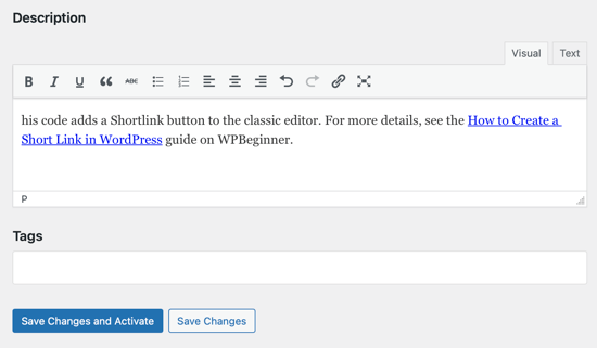 您还可以为代码片段分配标记。这将帮助您按照主题和功能对代码片段进行排序。最后,您需要单击“保存更改并激活”按钮。代码片段被激活后,快捷链接按钮将被添加到经典编辑器中。
