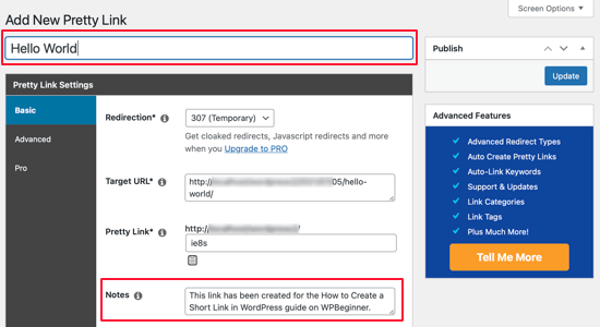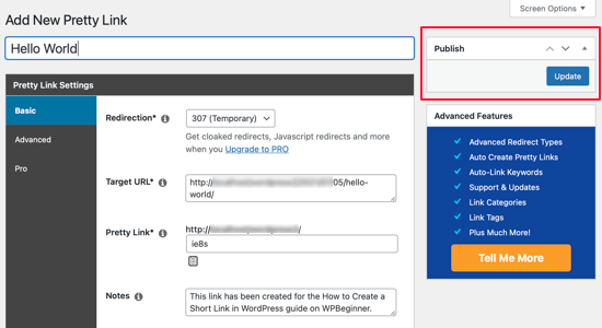 一旦你填写了漂亮的链接表格,点击更新按钮激活短链接。