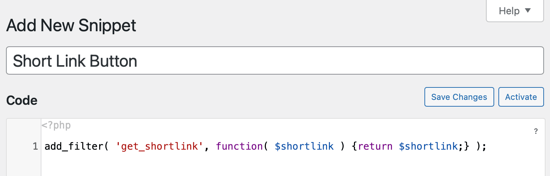 这将带您到“添加新片段”页面。您需要首先输入自定义代码片段的标题。我们称之为“短链接按钮”。输入标题后,只需将下面的代码片段复制粘贴到代码框中。