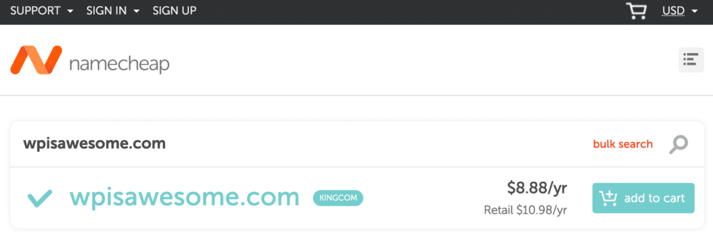 现在你可能已经猜到了,Namecheap是专门卖廉价域名的。在大多数情况下,这是正确的,因为我完成的大多数测试搜索提供的价格约为8美元。com域名。Namecheap也有很多特价,可以让你在头一两年得到一个非常便宜的域名。值得注意的是,其中一些促销活动消失了,但似乎Namecheap在价格上涨后仍然保持低利率。