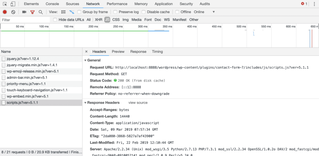 Contact 7是一个很棒的插件,可以在WordPress中构建和显示表单。它为我们的目的提供了一个完美的示例,因为它在每个页面上都包含以下文件,即使该页面不包含表单: