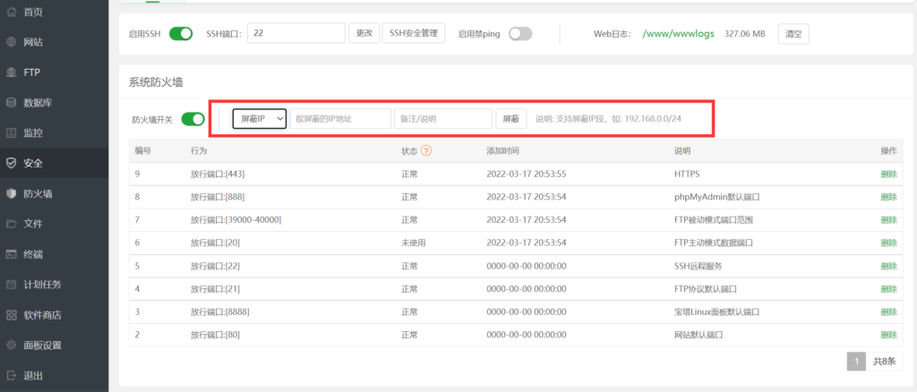 如果您使用Pagoda管理服务器,您可以通过Pagoda面板后台的“安全”添加被阻止的IP地址: