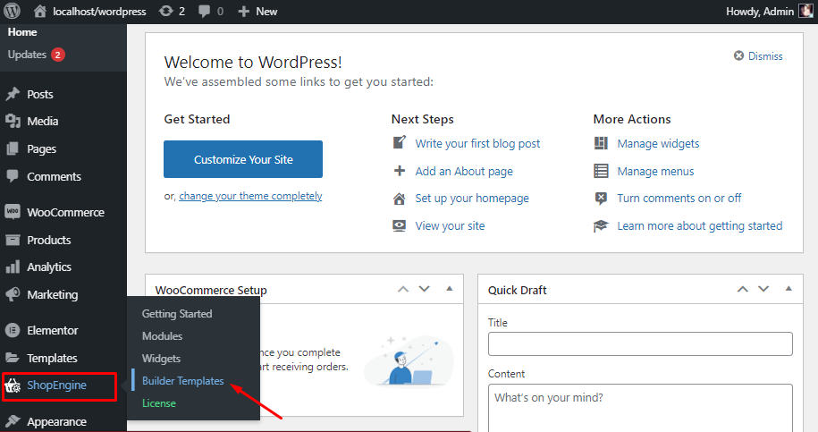 将鼠标悬停在商店引擎上,点击小工具,您将找到您的小工具库。请记住,我的帐户小工具捆绑包仅随ShopEngine Pro一起提供。