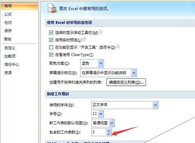 在展开的设置界面中,点击默认的常用按钮,同时找到“包含的工作表数”这个选项,默认的数字是3,可以修改默认的打开工作表数,可以设置为1等等