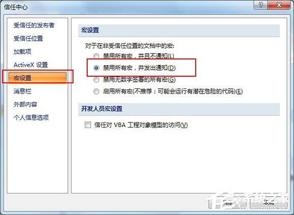 先安装一个VBA编辑器,在“Office共享功能”中有“Visual Basic for Application”要安装。启动Excel后,选左上角的大点,Excel选项-》信任中心-》信任中心设置-》宏设置-》“禁用所有宏,并发出通知”。