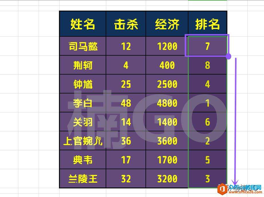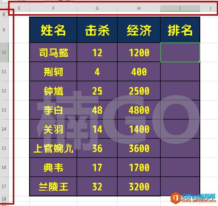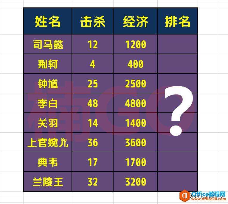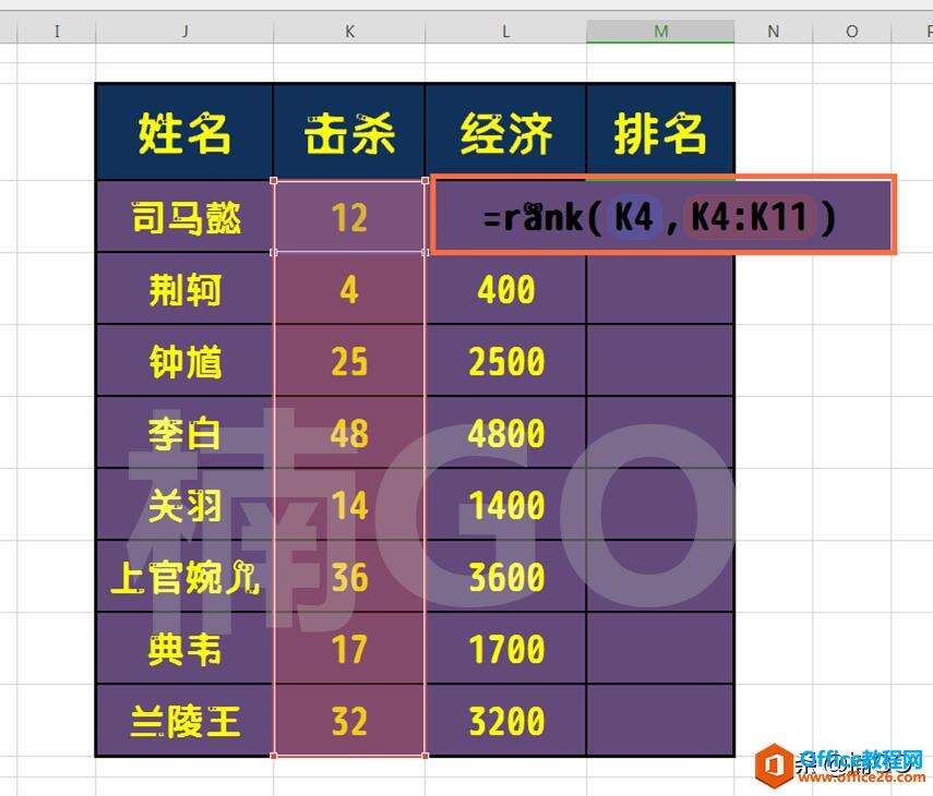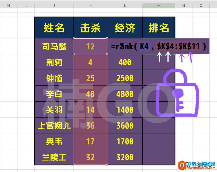 我的记忆方法很简单,只要有过LOL或王者荣耀体验的朋友,都不难快速记住这个公式。因为这些游戏中,都会常出现gank行为,那gank是为了什么呢?当然是为了排名(=rank)啊!可究竟是为了谁的rank排名呢?这还用说?自然谁排在第一行,就以谁为大啦,所以K4占第一行,那我们就先输入一个(K4),接着,再输入K4要去gank的对象群,也就是(K4:K11),那他的战果如何呢?当然是胜利啦,并且把敌方一个一个全部都锁死了,所以,我们公式的最终结果就是=rank(K4,$K$4:$K$11)啦。