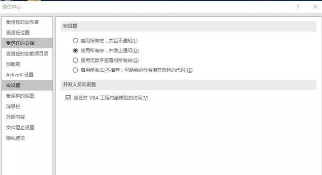 3.打开Excel选项——信任中心——信任中心设置——宏设置——安全性,选中“信任对于VBA工程对象模型的访问”,按确定即可。