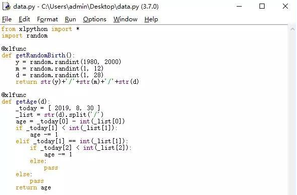from xlpython import * import random @xlfunc def getRandomBirth(): y = random.randint(1980, 2000) m = random.randint(1, 12) d = random.randint(1, 28) return str(y)+ / +str(m)+ / +str(d) @xlfunc def getAge(d): _today = [ 2019, 8, 30 ] _list = str(d).split( / ) age = _today[0] - int(_list[0]) if _today[1] < int(_list[1]): age -= 1 elif _today[1] == int(_list[1]): if _today[2] < int(_list[2]): age -= 1 else: pass else: pass return age