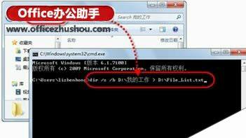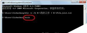 2、在命令行工具窗口中,按照“dir /s /s <文件列表来源文件夹> > <输出文件>”的格式输入命令,此处为“dir /s /b D:我的工作 > D:File_List.txt”,其意义为将“D:我的工作”文件夹中的所有文件和子文件夹中的文件完全路径名提取到位于“D:”盘根目录的“File_List.txt”文本文件中,如图2所示。