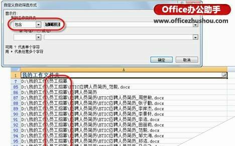 6、在“自定义自动筛选方式”对话框的“提示行”区域中,输入“员工招聘”,并单击【确定】按钮,此时工作表中只显示文件夹或文件名中包含此关键字的条目,如图6所示。