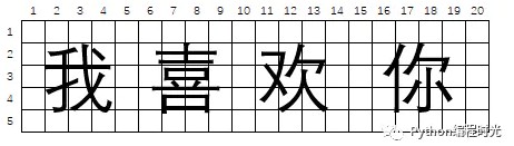 用 Excel 画了个图,每一方格代表一个像素,其中若我的字体的大小设置 5(非字号5,而是每个字占用5个像素),效果大概就是如下这样子。