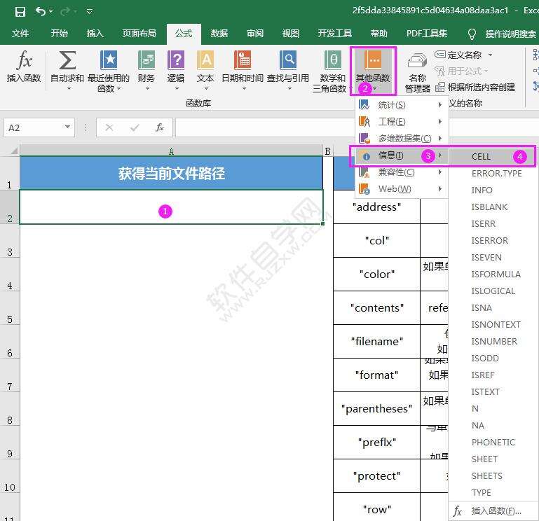 2、点击单元格,点击其他函数,点击信息函数,点击CELL函数。