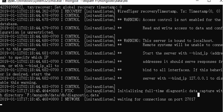 输入mongod –dbpath F:mongodbdatadb,然后出现一大段信息: