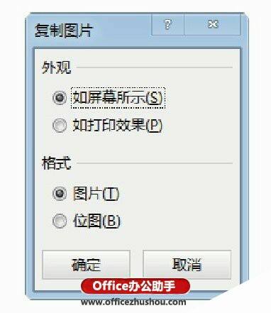 在“复制图片”对话框中,如果选择“如屏幕所示”单选按钮,则选定单元格区域中所有的可见内容都将复制为图片,此时可以在“格式”栏中选择一种格式,其中选择“图片”单选按钮获得的图片质量要高于“位图”单选按钮;如果选择“如打印效果”单选按钮,则复制的效果将和打印预览时看到的一样,此时“格式”栏中的“图片”和“位图”单选按钮将为灰色不可用。