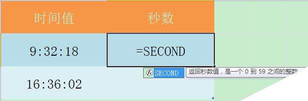 第一步,调用SECOND函数,即在指定单元格中输入“=SECOND”,在输入过程中Excel会自动提示函数的功能;