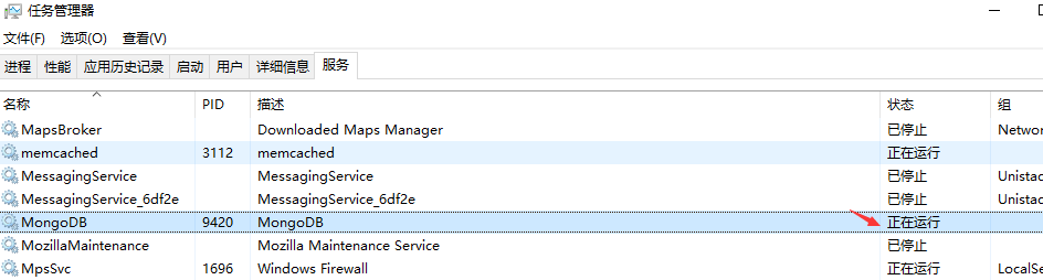 5、服务创建完成之后,默认是停止状态,我们需要手动打开服务,用命令,net start MongoDB,开启服务。