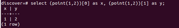 select (point(1,2))[0] as x, (point(1,2))[1] as y