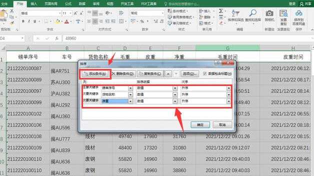 3.最后根据自己的排序需求,点击添加条件按钮,输入关键词信息进行升降序的排序设置即可