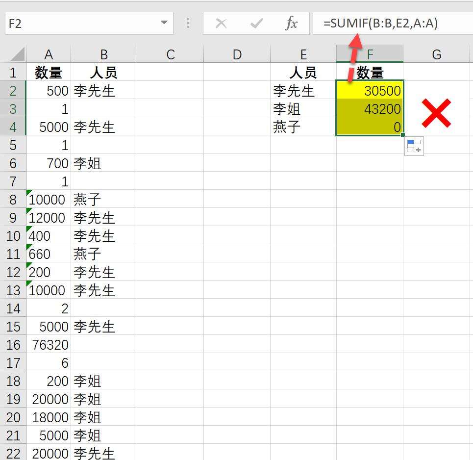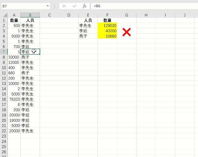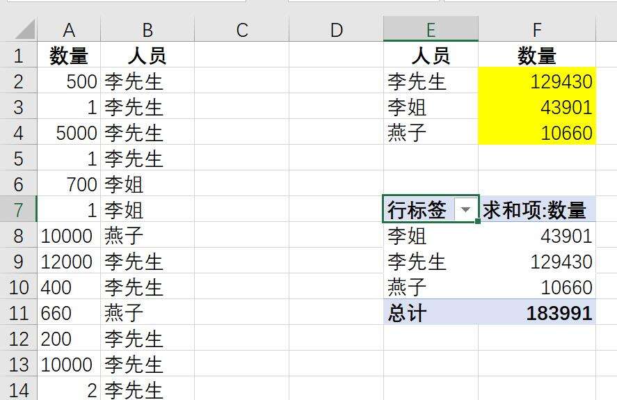 插入透视表,将人员拉到行,数量拉到值,结果跟公式一样,证明统计正确。