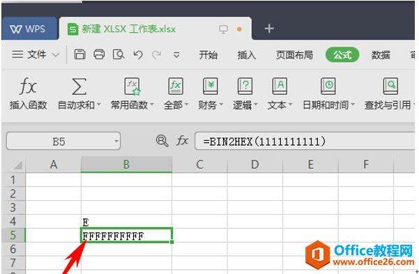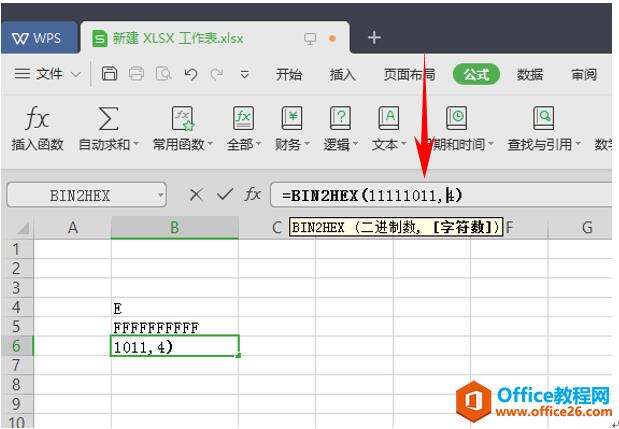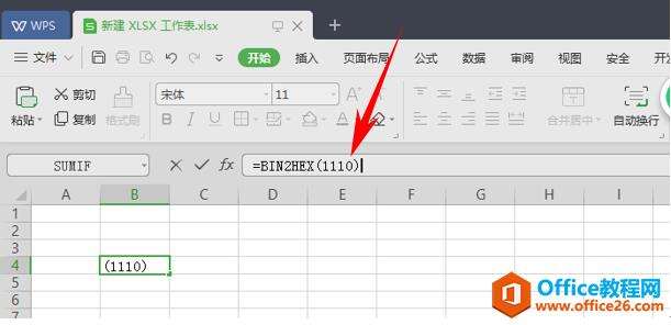 在表格内任意单击一个单元格,并在输入栏中输入“=BIN2HEX(1110)”