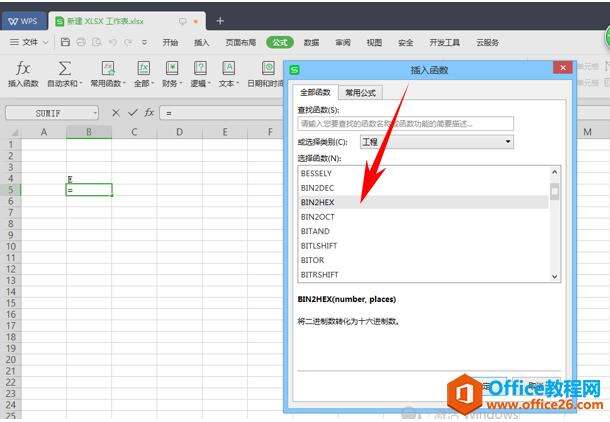 也可在工具栏中单击公式-插入函数,插入函数对话框中单击选择BIN2HEX函数。