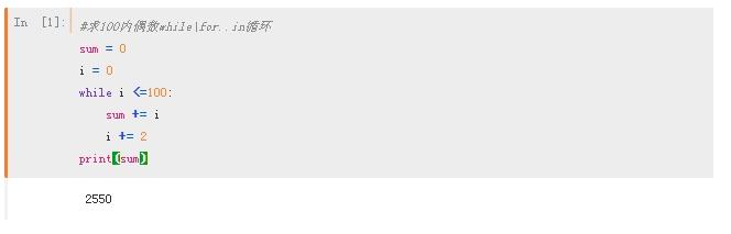 #求100内偶数whilefor..in循环 sum = 0 i = 0 while i <=100: sum += i i += 2 print(sum)