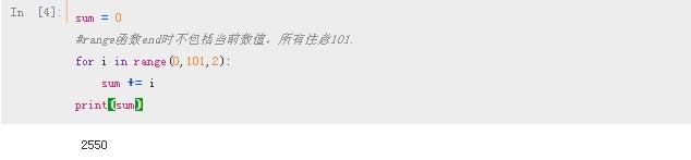 sum = 0 #range函数end时不包括当前数值,所有注意101. for i in range(0,101,2): sum += i print(sum)