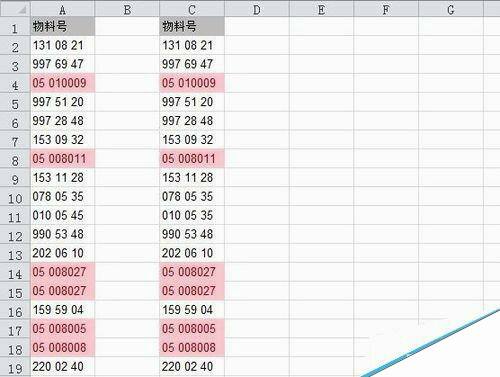 这里出现连续的不一致原因是左侧一列多出来一个物料,插入一行后,把该物料单独隔离出来,重新调整核对列,如下所示。
