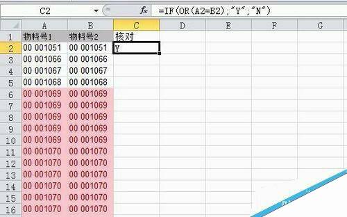 然后,把新的一列作为核对列,输入公式“=IF(OR(A2=B2);"Y";"N")”进行核对。相同为“Y”,不同为“N”。