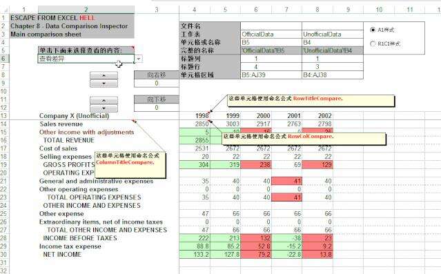 上图1中是用来呈现比较结果的工作表。我们可以看到,在该工作表左上方第6行的单元格下拉列表中,用来选择要查看的比较结果,右上方第2行至第8行区域指定要比较的文件名和工作表、起始单元格以及数据表标题列和标题行所占的数量,数值调节按钮用来控制进行比较的数据显示的行和列数。该工作表下方区域用来显示比较结果,其中绿色背景单元格表明一个工作表的数值比另一个工作表相同单元格中的数值大,红色背景单元格表明一个工作表的数值比另一个工作表相同单元格中的数值小,无背景色的单元格表示两个工作表在该处的单元格相同。