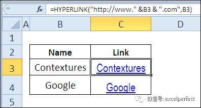 =HYPERLINK(“http://www.”&B3 & “.com”,B3)