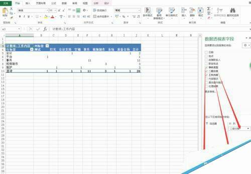 6、将我们要透视成数据的选项,拖动到相应的位置,行、列和数值中。