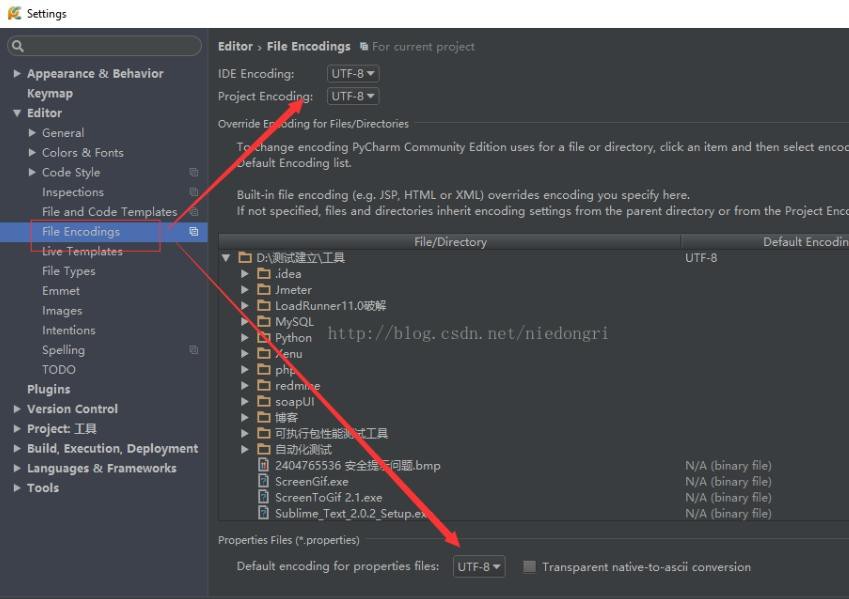 这种情况下,我们到settings—-Editor—-File Encodings里设置IDEEncoding/Project Encoding、Default encoding for properties都为UTF-8