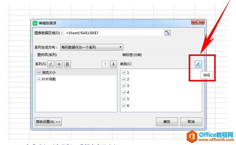 单击选择数据弹出编辑数据源对话框,我们开始编辑x轴数据,单击如图所示的“编辑”: