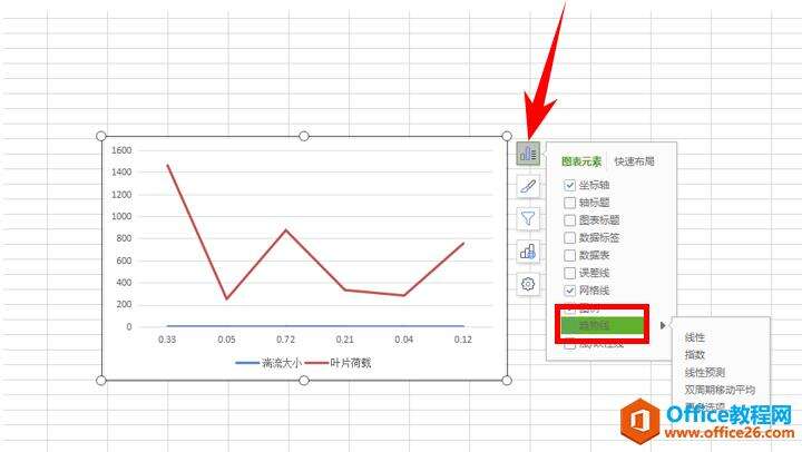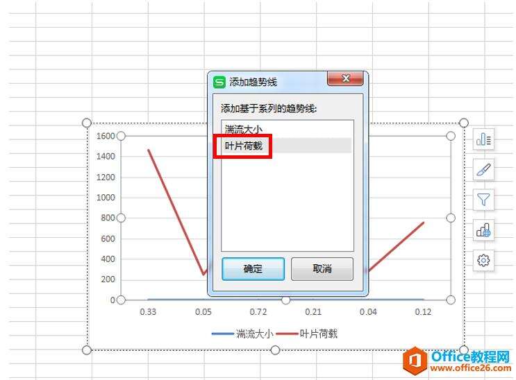 图表的数据都已经选择成功了,我们选择添加趋势线。单击趋势线–线性,弹出添加趋势线对话框,选择叶片荷载并确定: