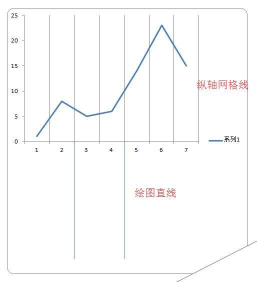 4、接下来,说下纵轴网格线,默认情况下的Excel图标只有横轴网格线,因此很多人问的插入与X轴垂直的直线,有的时候就是指纵轴网格线。