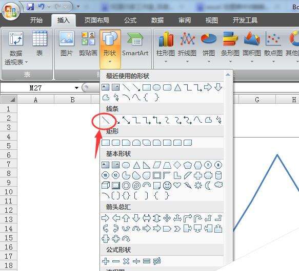 2、首先来说绘图功能得到的直线,主要用来对横轴的数据进行归类划分,分区对应纵轴的数据。具体操作为依次选择:开始–插入–直线。