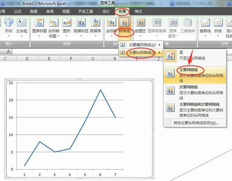5、选中图表,调出图表工具选项,依次选择:图表工具–布局–网格线–主要纵网格线–主要网格线。