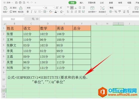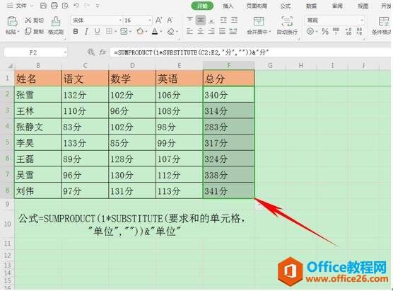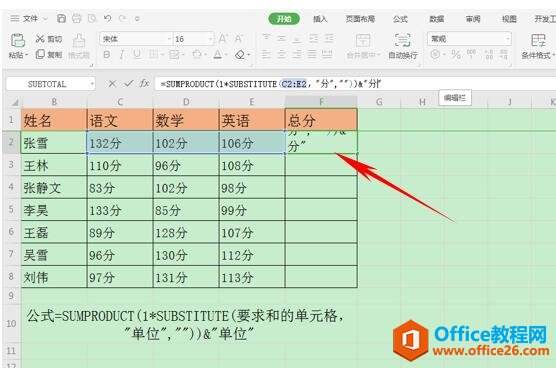 将公式复制,粘贴到总分下的单元格当中,将公式更改为=SUMPRODUCT(1*SUBSTITUTE(C2:E2,”分”,””)&”分”。单击回车。