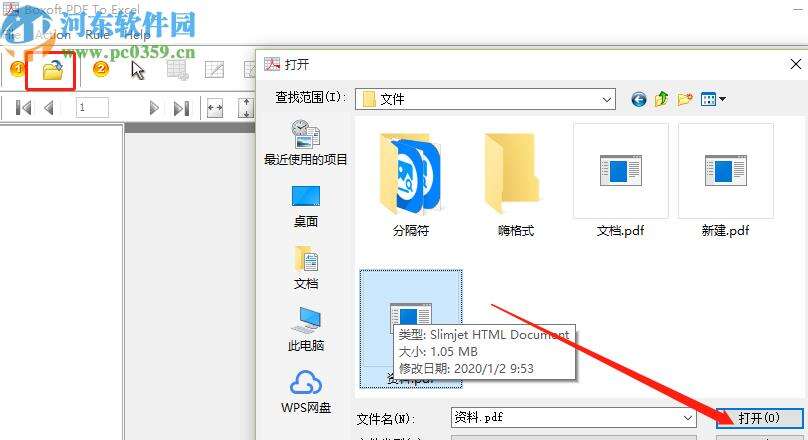 2.点击打开按钮之后文件就被成功加载到软件中了,然后我们需要点击界面上栏菜单中框出的这个图标,也就是选取识别表格数据区域的图标,点击之后在界面中的PDF文件上面选择区域即可。