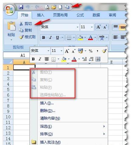 从图1中可以看出,单元格快捷菜单中的剪切、复制、粘贴等功能命令全变灰了,即表示不能使用了,但功能区和快速访问工具栏中的仍然可用。
