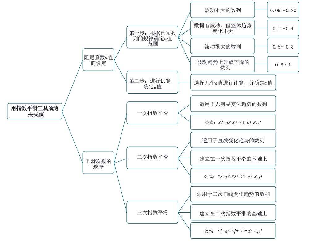 在确定平滑次数,并使用指数平滑工具进行计算后,就可以选择对应公式计算未来时间段的值。在3个平滑公式中:a表示阻尼系数。