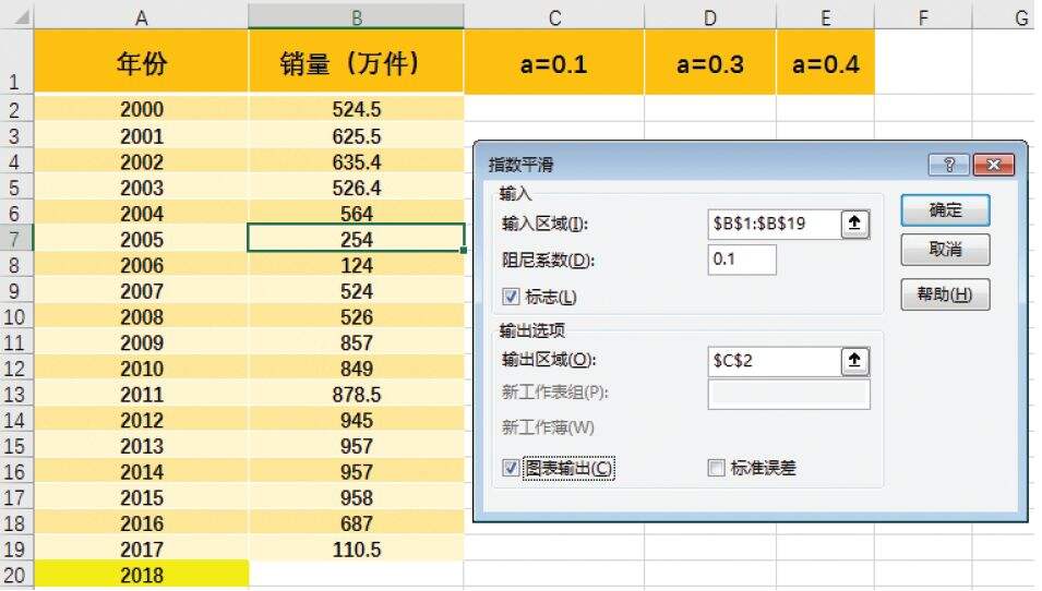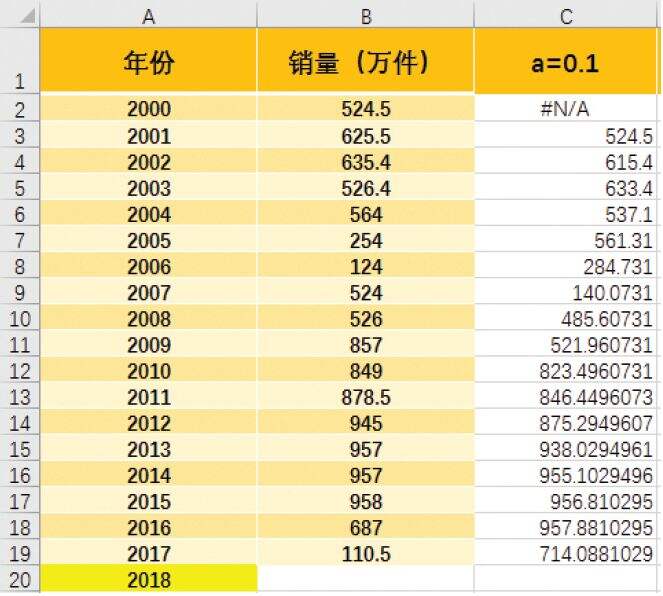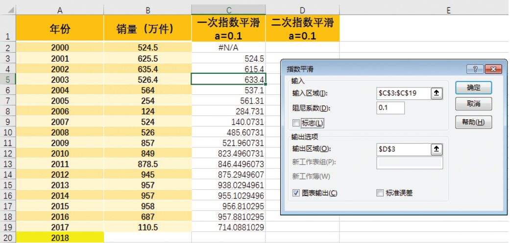 二次指数平滑:2018年的销量(二次)=a×2018年的销量(一次)+(1-a)×2017年的销量预测值(二次)。