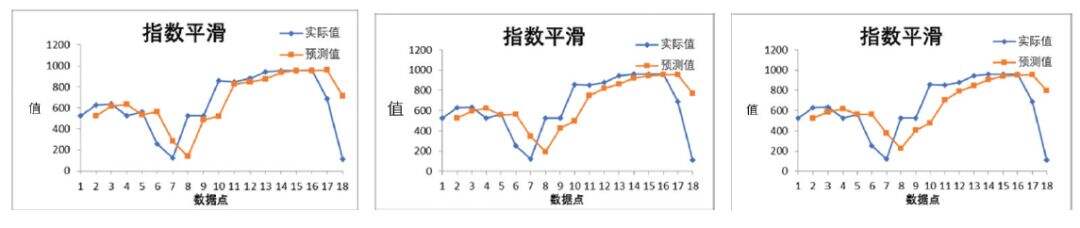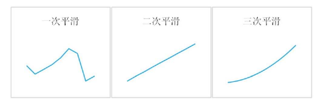 使用指数平滑工具预测未来值时,要根据数列的趋势线条选择平滑次数。其中,无规律的曲线只需要用一次平滑即可,直线型趋势数据要用二次平滑,二次曲线数据要用三次平滑,如下图所示。